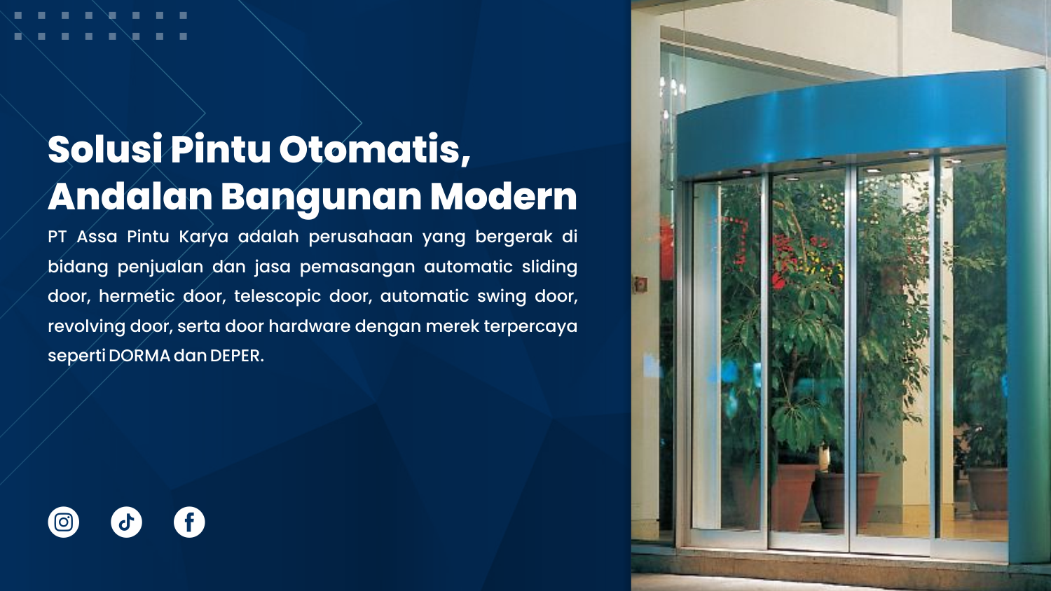 PT Assa Pintu Karya adalah perusahaan yang bergerak di bidang penjualan dan jasa pemasangan berbagai jenis pintu otomatis, seperti automatic sliding door, hermetic door, telescopic door, automatic swing door, dan revolving door. Kami juga menyediakan door hardware berkualitas tinggi dari merek ternama seperti DORMA dan DEPER, untuk memenuhi kebutuhan akses bangunan modern dengan standar keamanan dan estetika tinggi.